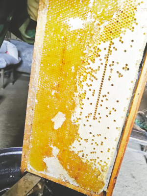 在貧困戶劉合英家,整齊擺放在房前屋后的16個(gè)蜂箱格外耀眼。來(lái)自養(yǎng)蜂合作社的技術(shù)員“全副武裝”,戴上手套和養(yǎng)蜂帽后輕輕打開(kāi)一個(gè)蜂箱蓋,提出蜂脾,用力地上下?lián)u晃,將附著在蜂脾上的蜜蜂搖下來(lái)后,用長(zhǎng)尖刀割去蜂蠟,濃稠金黃的蜂蜜順著蜂脾流淌,讓人垂涎欲滴。蜂蠟割下來(lái)后,技術(shù)員在搖蜜機(jī)的兩個(gè)卡位里各放上一塊蜂脾,開(kāi)始快速地轉(zhuǎn)動(dòng)搖柄,借助搖蜜機(jī)將蜂蜜從巢脾內(nèi)甩出,并順著桶壁流到桶底。技術(shù)員又拿出過(guò)濾網(wǎng),將搖出來(lái)的蜂蜜用過(guò)濾網(wǎng)過(guò)濾,過(guò)濾完后純凈的蜂蜜被裝入儲(chǔ)藏桶里。“真甜!”嘗了一口后,劉合英笑著說(shuō)。
