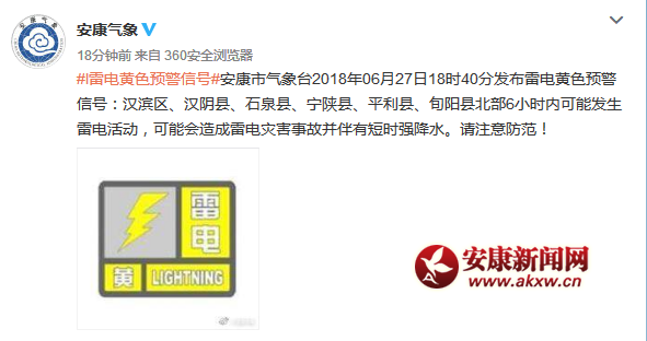 安康市氣象臺(tái)2018年06月27日18時(shí)40分發(fā)布雷電黃色預(yù)警信號(hào):漢濱區(qū)、漢陰縣、石泉縣、寧陜縣、平利縣、旬陽(yáng)縣北部6小時(shí)內(nèi)可能發(fā)生雷電活動(dòng),可能會(huì)造成雷電災(zāi)害事故并伴有短時(shí)強(qiáng)降水。請(qǐng)注意防范! wK5安康新聞網(wǎng)