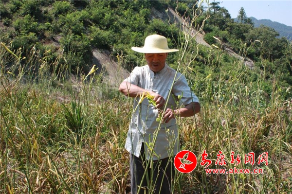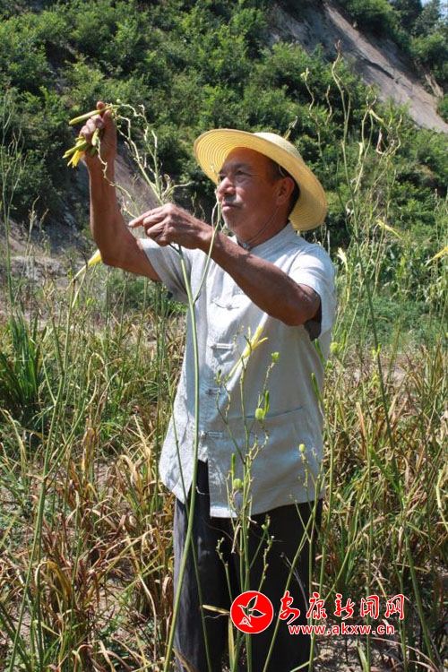 邊介紹著趙德友轉(zhuǎn)身拿來草帽,引著記者前往“讓他高興”的一畝二分地黃花地,邊走邊說:“今年黃花菜還沒有進入豐產(chǎn)期,所以自家也種了玉米、花生等作物,有時候也忙不過來,我和老伴兒呢,早上4點多就起床,不到5點就打著手電到地里除雜草、防蟲。想著明年才能到豐產(chǎn)期,也就沒怎么施肥,但沒想到今年6月開始黃花盛開,想著老兩口就能摘得過來,沒想到了后來不得不找鄰居幫忙摘花。”