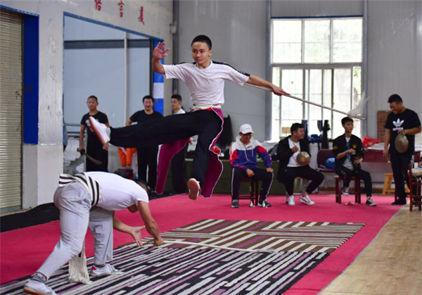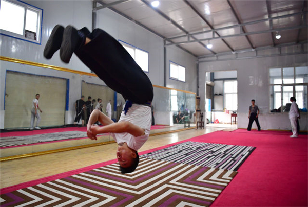 9月12日,“童子班”學(xué)員在練功房?jī)?nèi)練習(xí)翻跟頭。