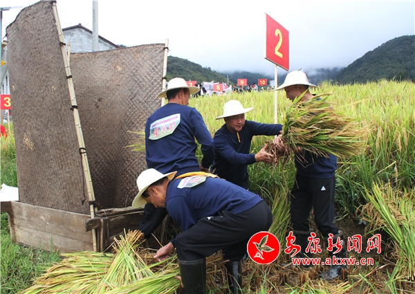 隨著一聲響亮的哨令,來(lái)自全縣12個(gè)鎮(zhèn)12支參賽隊(duì)伍展開(kāi)了一場(chǎng)熱火朝天的田間打谷賽。割稻、打谷、捆扎、計(jì)時(shí)、稱(chēng)重……隊(duì)員動(dòng)作嫻熟,氣氛緊張激烈。歷經(jīng)2個(gè)小時(shí)的激烈比賽,全縣12個(gè)鎮(zhèn)打谷共計(jì)3100斤,南宮山鎮(zhèn)獲得冠軍。