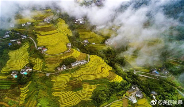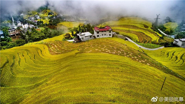 (以下圖為9月15日無人機拍攝的嵐皋縣南宮山鎮(zhèn)桂花村一派豐收景象的古梯田)GyG安康新聞網