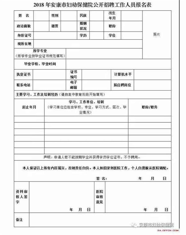 3.報(bào)名要求:應(yīng)聘人員需在報(bào)名前,登錄安康市婦幼保健院官網(wǎng)(http://www.akfy.com.cn),下載打印《2018年安康市婦幼保健院公開(kāi)招聘工作人員報(bào)名表》,用黑色中性筆填寫(xiě),提供近期2寸免冠照片2張、本人身份證、畢業(yè)證、教育部學(xué)歷在線(xiàn)驗(yàn)證報(bào)告、學(xué)位證、就業(yè)推薦表(應(yīng)屆生)及應(yīng)聘崗位需要的證書(shū)原件及復(fù)印件。