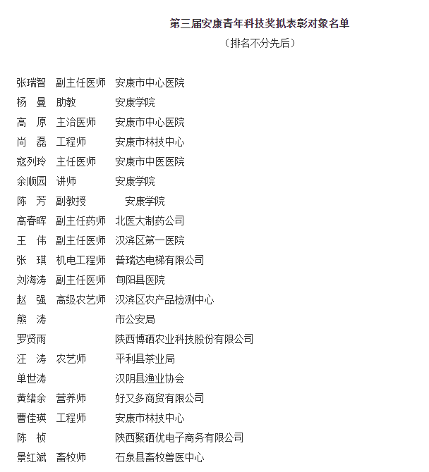 根據(jù)中共安康市委組織部、安康市人力資源和社會保障局、安康市科學技術協(xié)會《關于開展第三屆安康青年科技獎候選人推薦與評選工作的通知》(安科協(xié)發(fā)〔2018〕35號)精神,經各縣區(qū)、各相關單位審核推薦,市專家評審會評議,市評選工作領導小組會議審定,現(xiàn)對張瑞智等20名“第三屆安康青年科技獎”擬表彰對象予以公示。公示時間為2018年12月3日至2018年12月7日。歡迎廣大干部群眾對公示對象進行監(jiān)督。