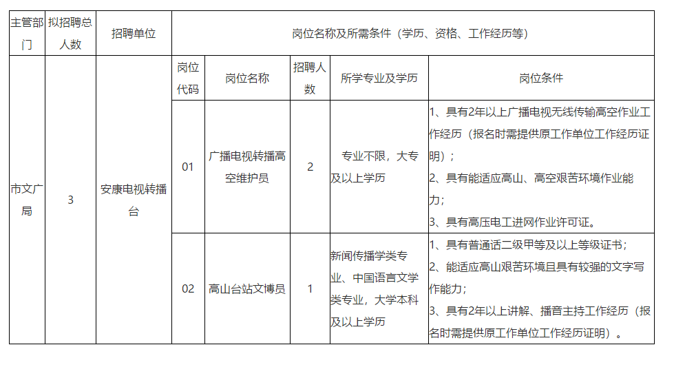 一、招聘崗位及人數(shù):廣播電視轉(zhuǎn)播高空維護員2人、高山臺站文博員1人,具體招聘崗位人數(shù)和條件要求詳見《安康電視轉(zhuǎn)播臺特殊崗位人才招聘崗位一覽表》(附后)。