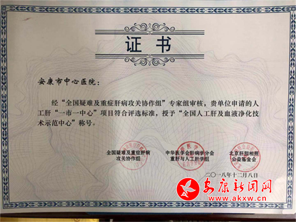 安康新聞網(wǎng)訊(通訊員 江自成 王月) 2018年12月7日-8日,第二屆“實(shí)用人工肝及血液凈化技術(shù)培訓(xùn)班暨高峰論壇”在北京召開,同時(shí)舉行了全國(guó)人工肝“一市一中心”項(xiàng)目的授牌儀式,為首批68家通過審批的醫(yī)院授牌,其中安康市中心醫(yī)院通過該項(xiàng)目評(píng)選,被授予“全國(guó)首批人工肝及血液凈化技術(shù)示范中心”稱號(hào),同時(shí)該院也是陜西省首批獲得此稱號(hào)的單位。