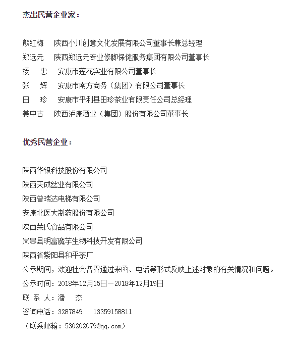 安康新聞網訊 經市委同意,現將我市擬推薦陜西省杰出民營企業(yè)家和優(yōu)秀民營企業(yè)名單公示如下:SFp安康新聞網