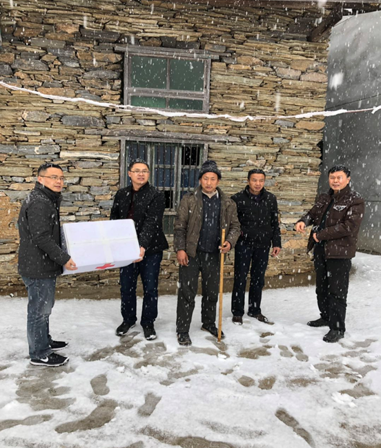 離開老王家,我們又前往胡登定和胡登平家,村干部說這是兩兄弟。由于雪大路滑,周組長親自上手幫忙搬運(yùn)慰問品,在大家的共同努力下,我們沿著濕滑的小路把慰問品搬到他們家門口,令我們驚訝的是,胡登定杵著拐杖在院壩迎著我們,村干部介紹說,你看他年輕輕的,就是因?yàn)樵谕饷鎰?wù)工腿部受了重傷,現(xiàn)在失去了勞力,只能在家種點(diǎn)菜勉強(qiáng)維持生計(jì)。通過我們與他深入交談后,他說:“我首先要感謝你們,感謝我們黨的好政策,讓我們殘疾人看到了生活的希望,只要我有一只手能動,我就要通過自己的努力養(yǎng)活好自己,不給家人添麻煩,不給我們村上增負(fù)擔(dān)”。