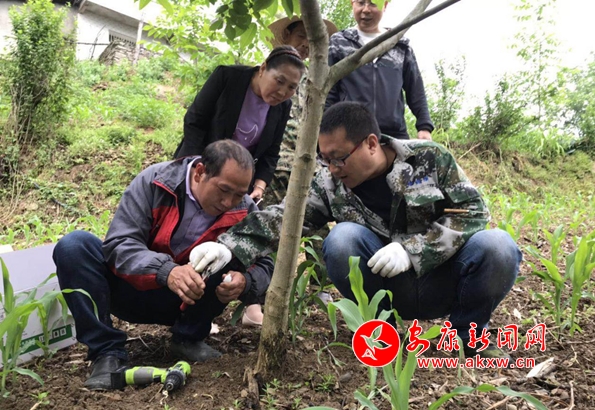 日前,高橋鎮(zhèn)雙龍村的核桃園里來了一群特殊的客人。他們沒有白大褂,而是一身迷彩的科技工作人員。手里拿著電鉆、針劑蹲在核桃樹下給村民示范講解技術要領。“對著果樹的根部,用電鉆斜角打孔2公分左右,剪掉針劑的頭,然后把針插進去就好了”。“嘿!這個辦法好,簡單唆!”,村名劉永宣說到。交談中得知,劉永宣今年70歲了,家里有兩畝核桃,三四年都沒有收成。看著掛著果子,不是黑咯!就是提前掉落。以前給核桃樹打藥奏背個藥箱噴一哈,可奏是么得啥效果。眼瞅著好好的果樹,就是變不了錢,他也著急。