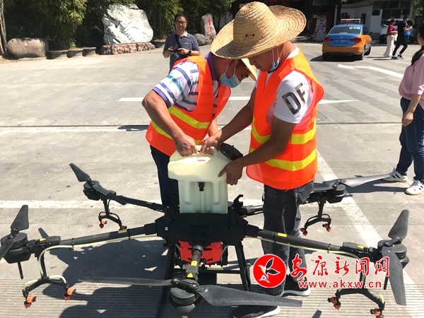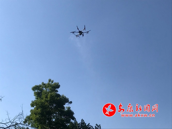 “看,樹上有駕飛機”,不知是誰高喊了一聲。附近的人們抬起頭就看見不遠處一架無人機在樹頂上來回穿梭,“嗡、嗡”的聲響如同蜜蜂飛行放大了幾十倍。只見無人機操控員手持遙控器,熟練的指揮無人機時而懸停作業(yè)、時而緩緩飛行、時而高空俯沖,黝黑的機身下拽一條勻稱的白色霧帶。