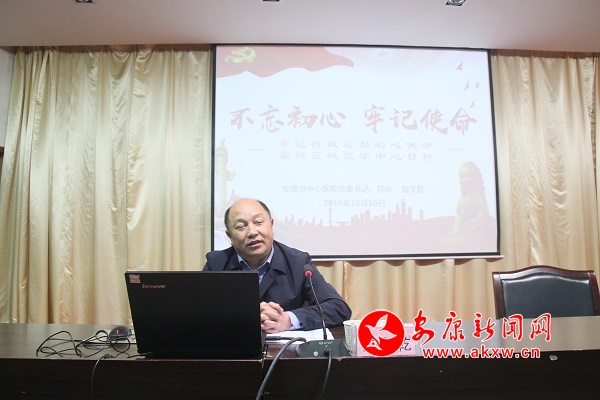 本網(wǎng)訊 10月10日晚上7點,安康市中心醫(yī)院召開“不忘初心、牢記使命”主題教育專題黨課,醫(yī)院黨委書記、院長陳文乾以“牢記行政后勤初心使命,實現(xiàn)區(qū)域醫(yī)學(xué)中心目標”為題,從“牢記醫(yī)院行政后勤初心使命、當前行政后勤存在的主要問題、做好新時期醫(yī)院行政后勤工作”等三個方面進行專題黨課輔導(dǎo)。院領(lǐng)導(dǎo)班子成員、行政職能后勤人員200余人聆聽了黨課。副院長董根文主持專題黨課。