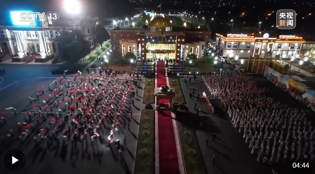 1500多名身著民族盛裝的塔吉克斯坦青年表演富有濃郁特色的中塔歌舞,揮舞中塔兩國(guó)國(guó)旗,表達(dá)對(duì)中國(guó)最尊貴客人的熱烈歡迎。