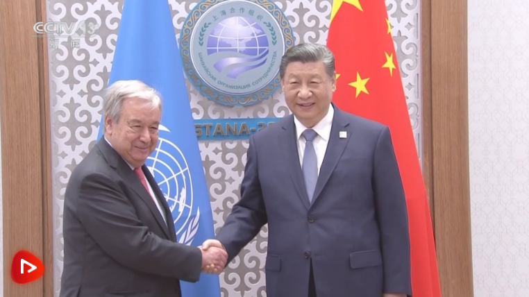 當?shù)貢r間7月4日下午,國家主席習近平在阿斯塔納出席上海合作組織峰會期間會見聯(lián)合國秘書長古特雷斯。