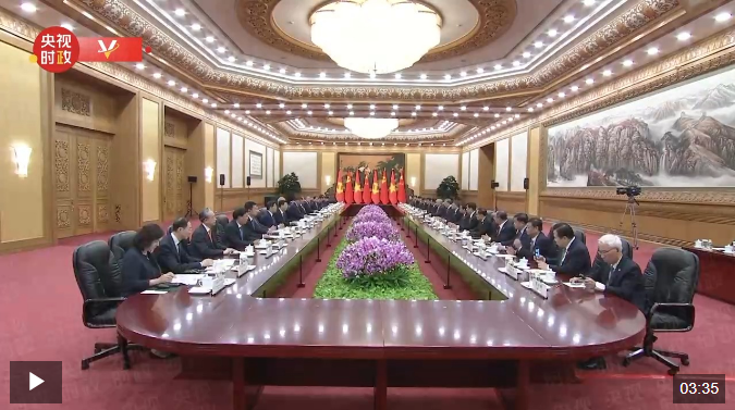 習(xí)近平指出,歡迎蘇林總書記、國家主席同志對中國進(jìn)行國事訪問,再次祝賀你當(dāng)選越共中央總書記。你就任總書記后首訪就來到中國,充分體現(xiàn)了你對兩黨兩國關(guān)系的高度重視,也體現(xiàn)了中越關(guān)系的高水平和戰(zhàn)略性。我愿同你建立良好工作關(guān)系和個(gè)人友誼,共同引領(lǐng)中越命運(yùn)共同體建設(shè)走深走實(shí)。